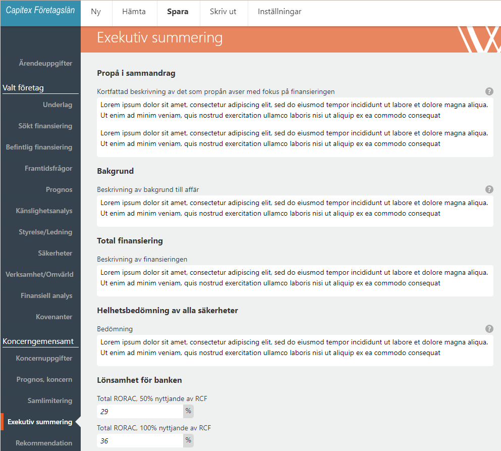 Executive summary is a summary of the entirety of the credit proposal. It applies to one or more companies and is the overall assessment of the case.