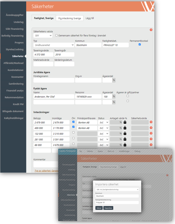 Go to the page Säkerheter / Collateral and select the collateral type "Fastighetsinteckning" / "Real estate mortgage" and click on "Import property Sweden".