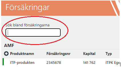 Gör sökningen genom att mata in önskat sökbegrepp (siffror och/eller bokstäver) i rutan och sökning görs på alla uppgifter som syns i försäkringslistan.