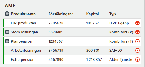 Antalet försäkringar som kan registreras i systemet är obegränsat, och det är inte helt ovanligt att en person har fler än 20 stycken. För att använda Capitex Pension optimalt är det viktigt att försäkringarna registreras på rätt sätt. Registreringen av försäkringstyperna är därför indelade i flera huvudgrupper som var och en består av flera typer. Huvudgrupperna är Privata pensioner, Individuella tjänstepensioner, Kapitalförsäkringar och Avtalsenliga tjänstepensioner. Därtill finns Kombinerad försäkring (P) privat och Kombinerad försäkring (T) tjänste. Dessa två kombinerade är ofta en pensionsplan och består av mer än en grundförsäkring.