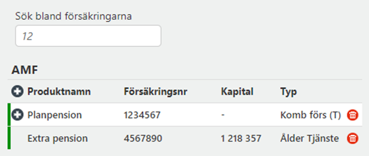 I detta fall har sökning gjorts på ”12” i nedanstående försäkringslista och som syns på bilden ovan har det resulterat i en träff på en försäkring med uppgiften i försäkringsnumret och en med det i kapitalet.